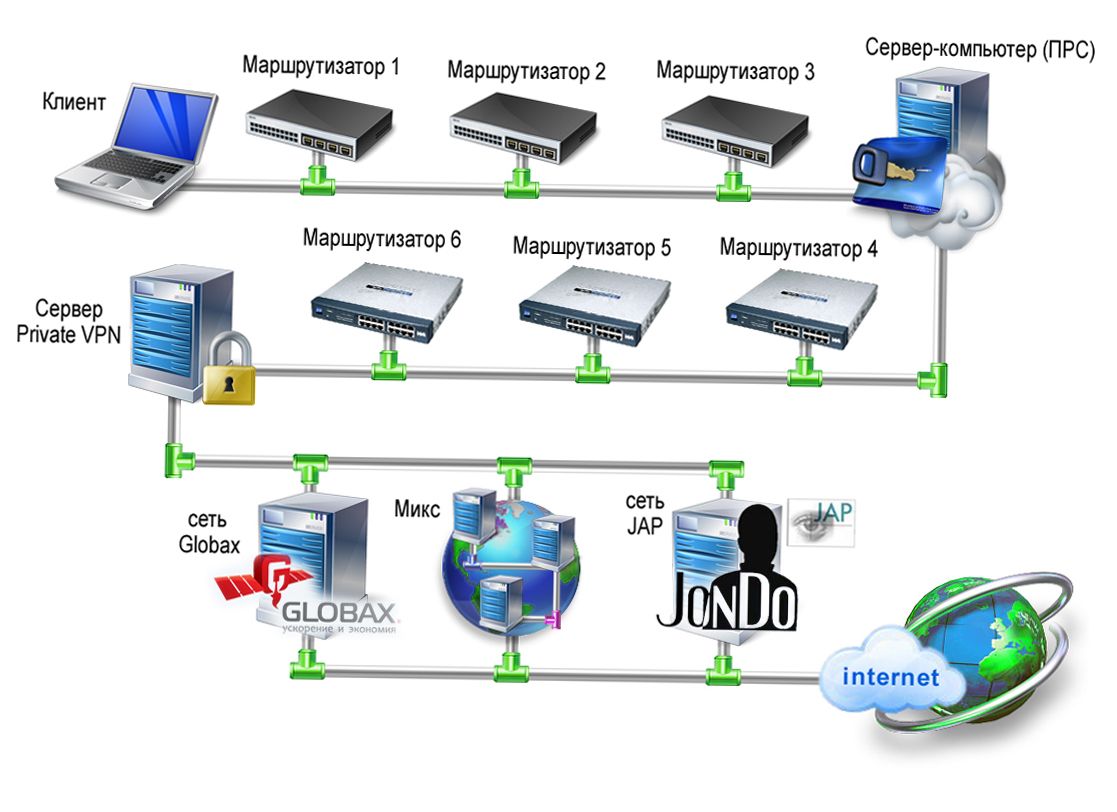 1. Клиент, подключаясь к системе, проходит цепочку маршрутизаторов, находящихся в разных странах. На каждом из маршрутизаторов трафик перешифровывается и меняет порт назначения используя технологию vpn, в итоге подключение к удаленному серверу-компьютеру (это как раз тот компьютер, от которого вам выдается доступ) происходит из внутренней сети, что гарантирует конфиденциальность подключения и делает всех клиентов равнозначными, не позволяя разделить трафик одного от другого;